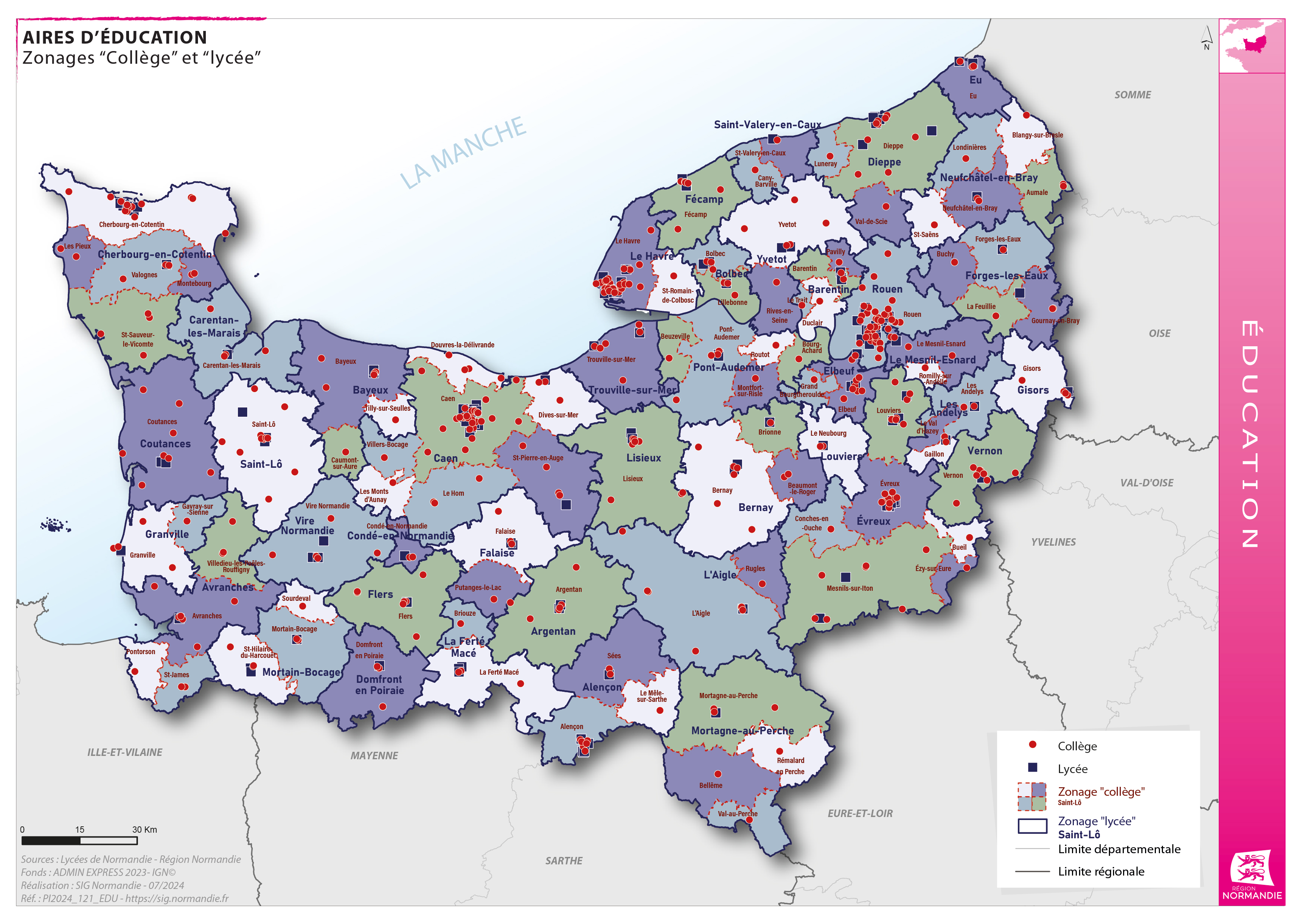 La carte représente les zonages des "collèges" et des "lycées". Ils ont été arrêtés par la Direction des lycées de Normandie dans le cadre de travaux de projections d’effectifs et sont inspirés des zonages proposés par la Direction de l'évaluation, de la prospective et de la performance (DEPP) du ministère de l'éducation nationale et de la jeunesse.