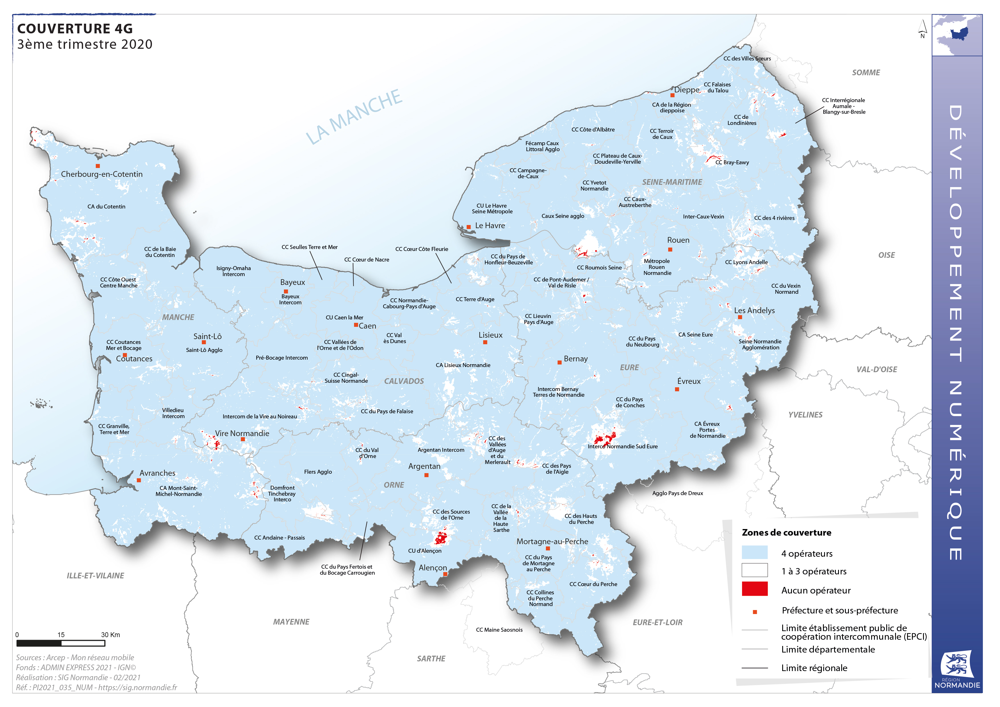 Si vous utilisez cette carte dans une publication ou dans une présentation, merci de respecter son intégrité et de mentionner les crédits : Réalisation : SIG Normandie - 02/2021 Sources : Arcep - Mon réseau mobile Fonds : ADMIN EXPRESS 2021- IGN©