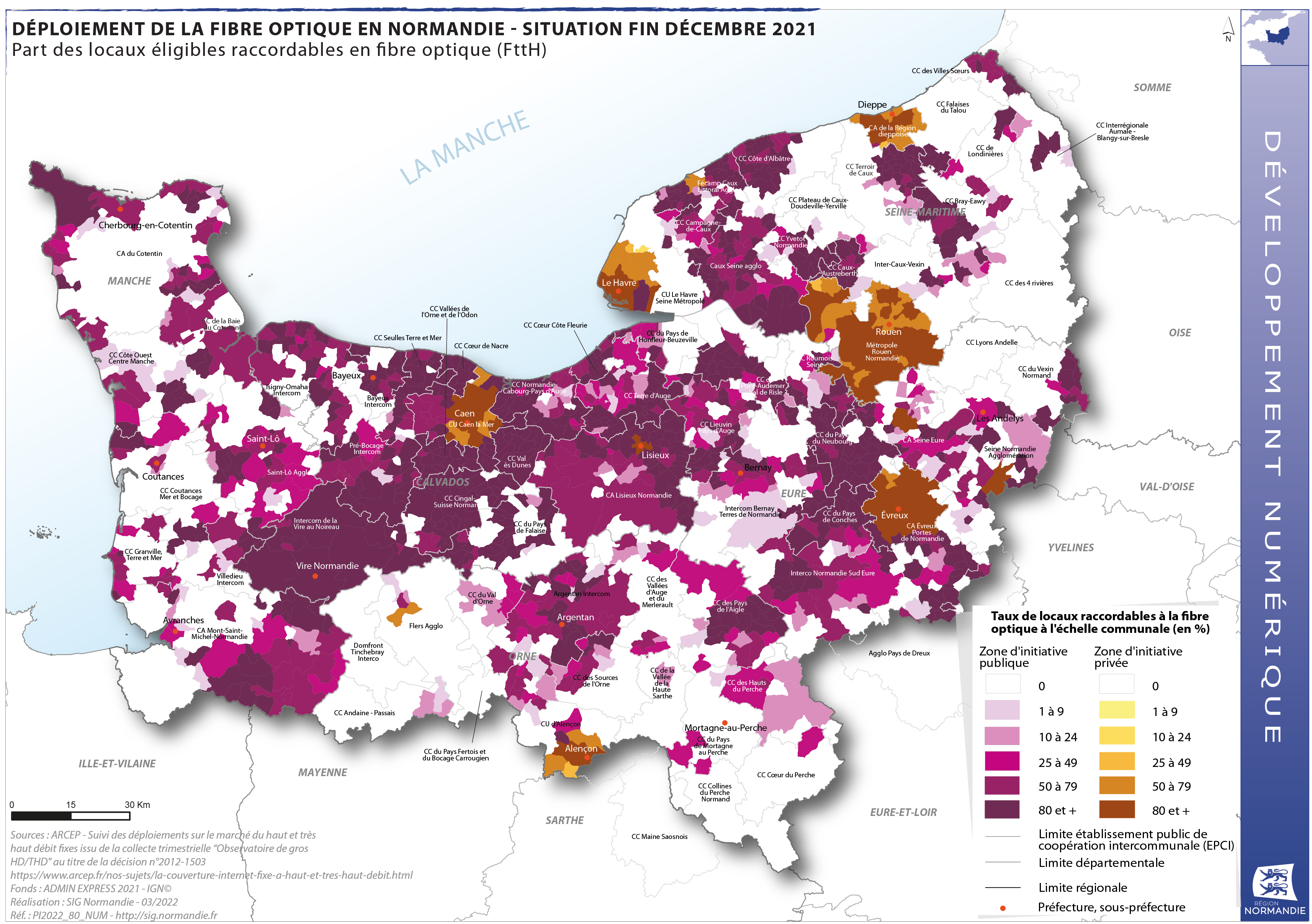 Cette carte présente donc le déploiement de la fibre optique en Normandie à la fin décembre 2021 en soulignant la part des locaux éligibles raccordables en fibre optique (FttH) à l'échelle des communes et en distinguant les zones d'initiatives publiques des zones d'initiatives privées.