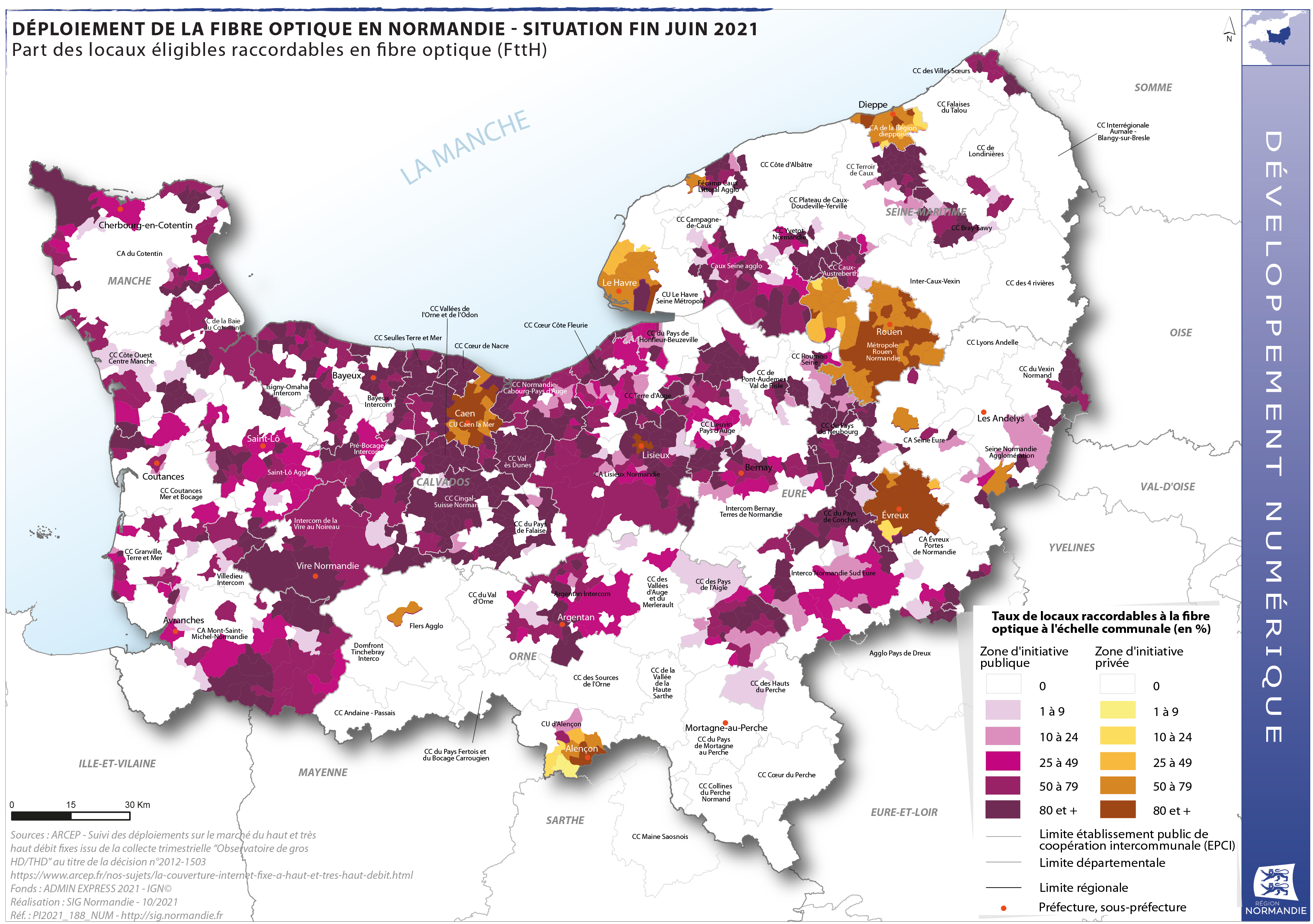 Cette carte présente donc le déploiement de la fibre optique en Normandie à la fin juin 2021 en soulignant la part des locaux éligibles raccordables en fibre optique (FttH) à l'échelle des communes et en distinguant les zones d'initiatives publiques des zones d'initiatives privées.