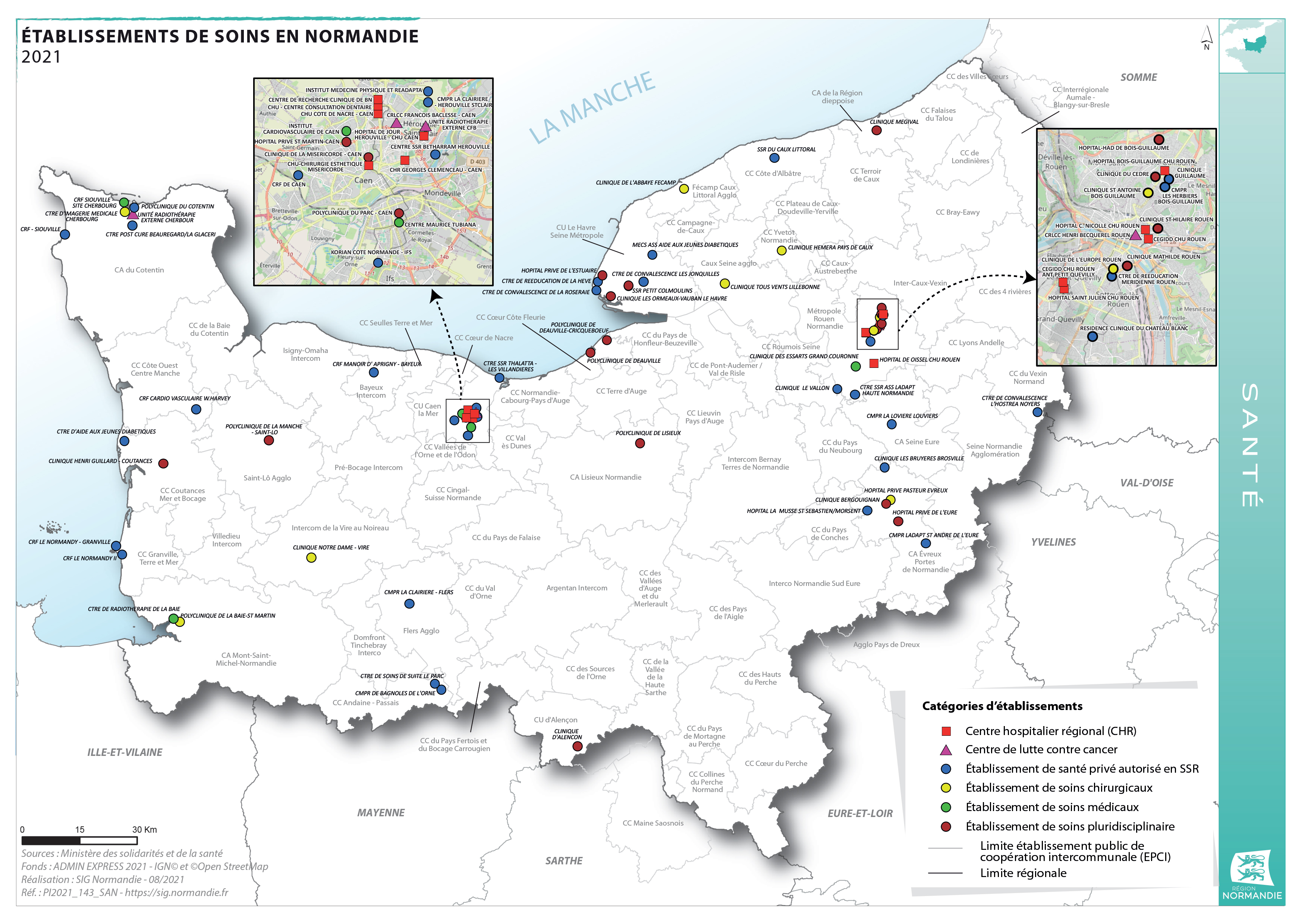 Cette carte représente les établissements de soins en Normandie recensés dans le Fichier national des établissements sanitaires et sociaux (FINESS) et selon différentes catégories :