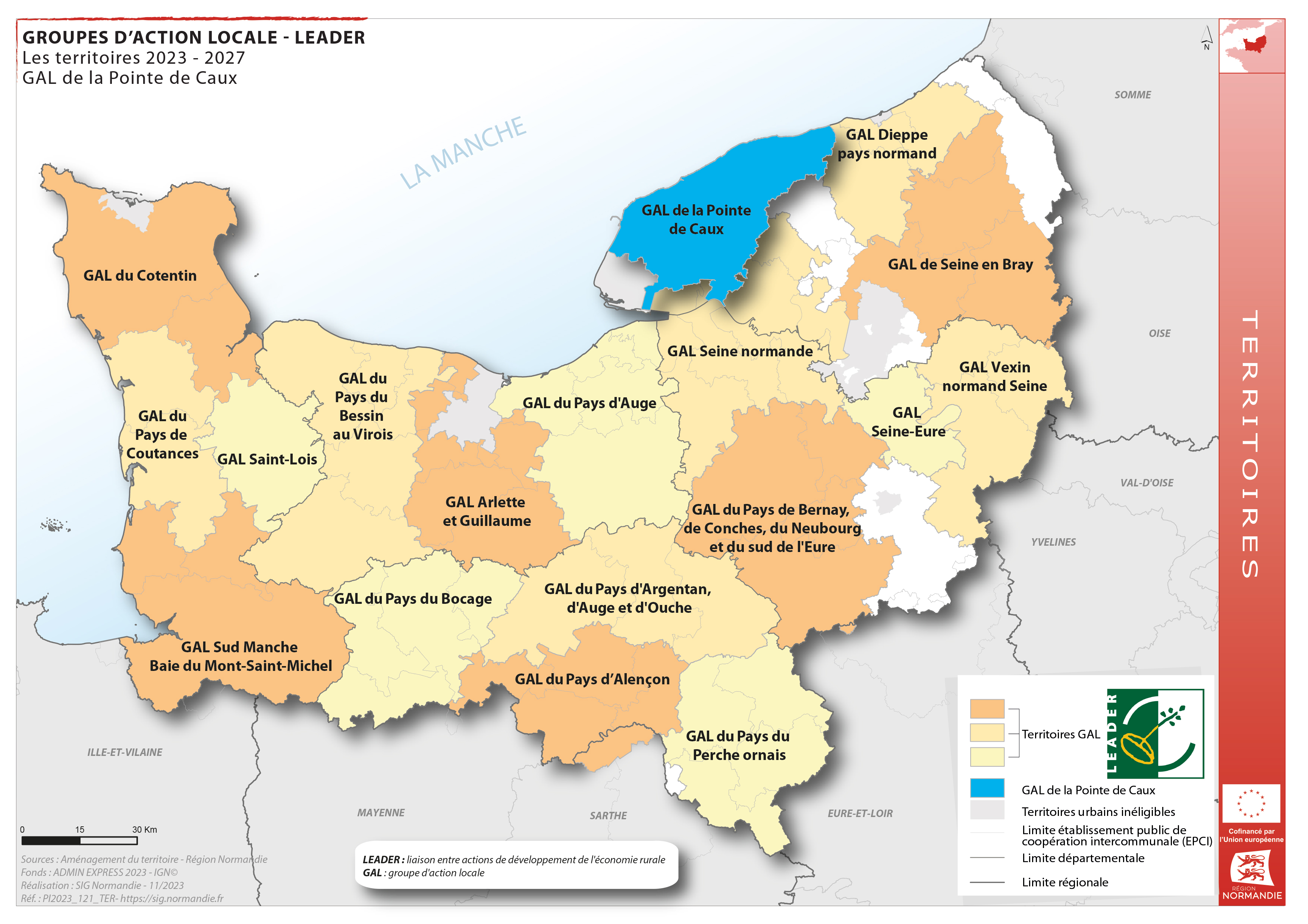 La Normandie comptabilise 18 GAL. La donnée des périmètres des GAL normands ayant servi à réaliser cette cartographie, est disponible ici. Vous pouvez également consulter la ressource cartographique dynamique dédiée aux territoires LEADER pour la période 2023-2027.