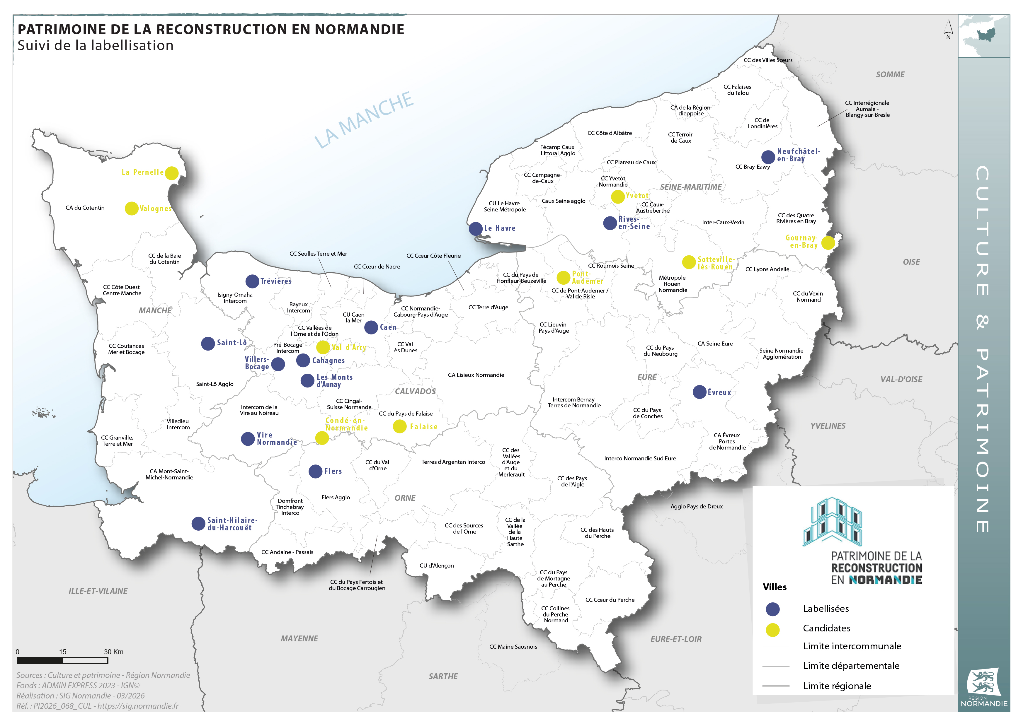 Consciente des atouts de son abondant patrimoine de la Reconstruction et de la nécessité de le mettre davantage en valeur, la Région Normandie a créé le label "Patrimoine de la reconstruction en Normandie". Il vise à prendre en compte à la fois l'intérêt historique et architectural de ce patrimoine, son potentiel culturel et touristique et sa place dans l'aménagement du territoire et dans le cadre de vie des habitants.