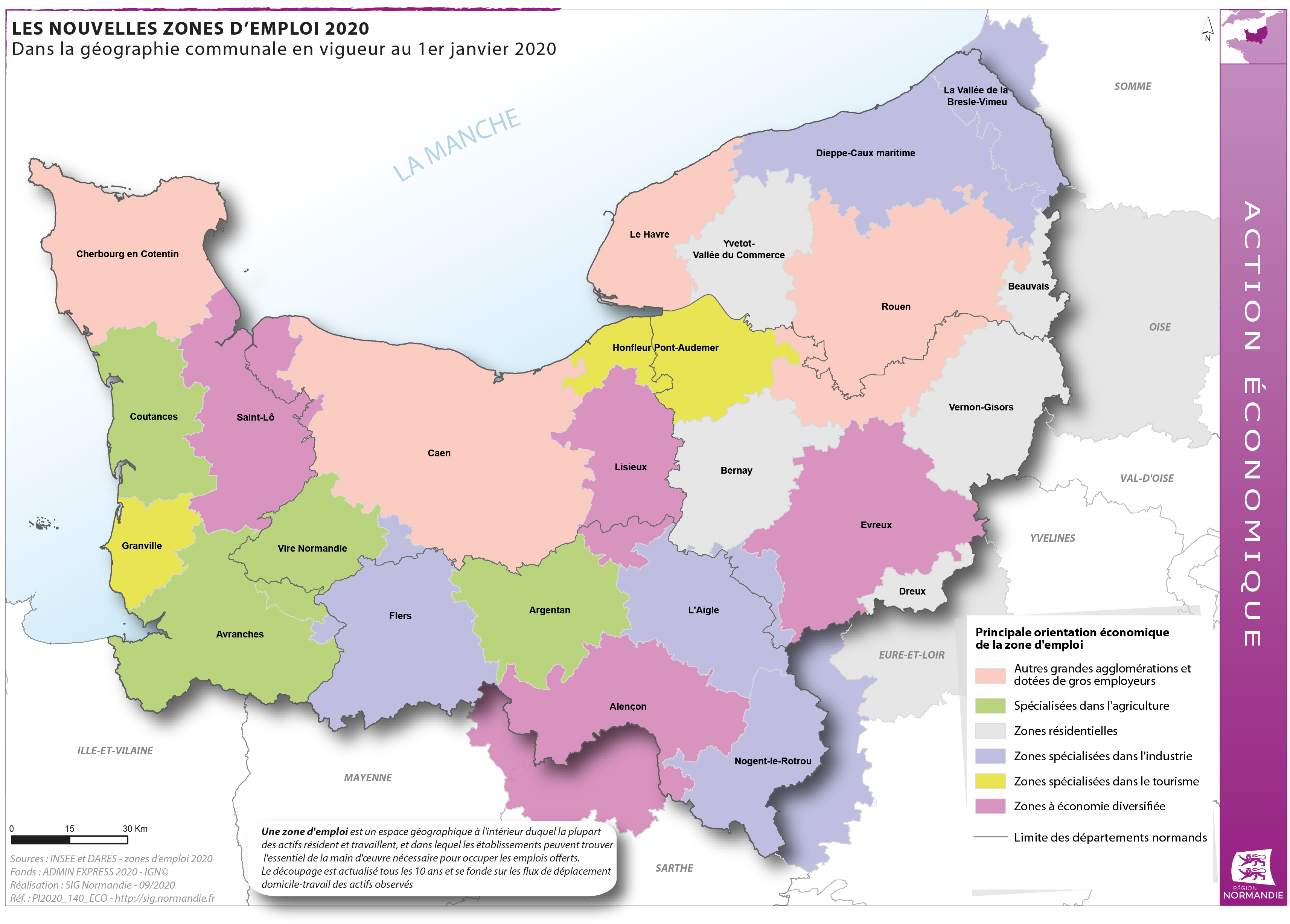 La Normandie compte 24 zones d'emploi dont 5 trans-régionales.