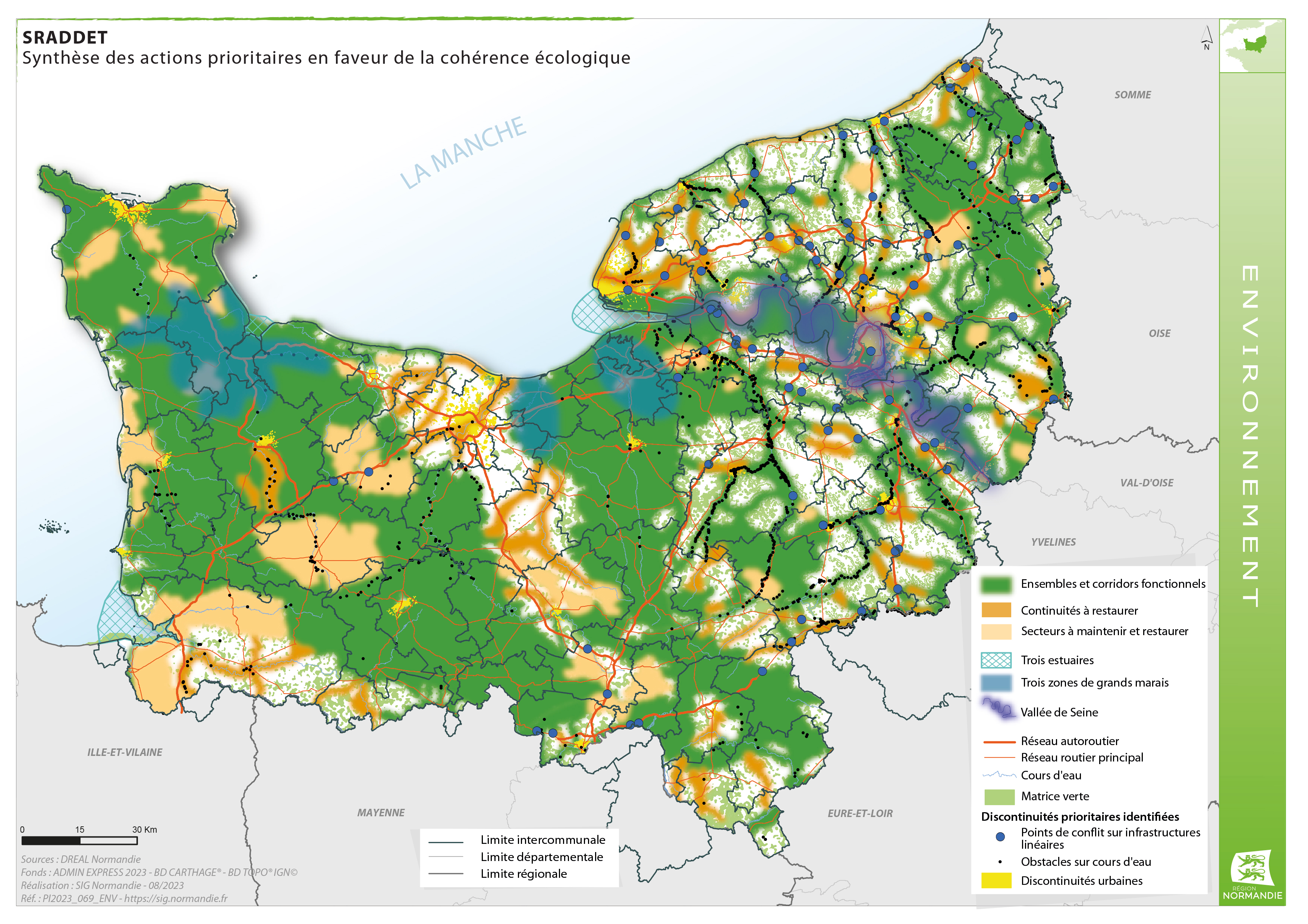 En complément du rapport d'objectif du Schéma régional d’aménagement, de développement durable et d’égalité des territoires (SRADDET) de la Région Normandie, la carte de "Synthèse des actions prioritaires en faveur de la cohérence écologique" est intégrée aux annexes du SRADDET dans le plan d’actions stratégique en faveur de la cohérence écologique en Normandie.