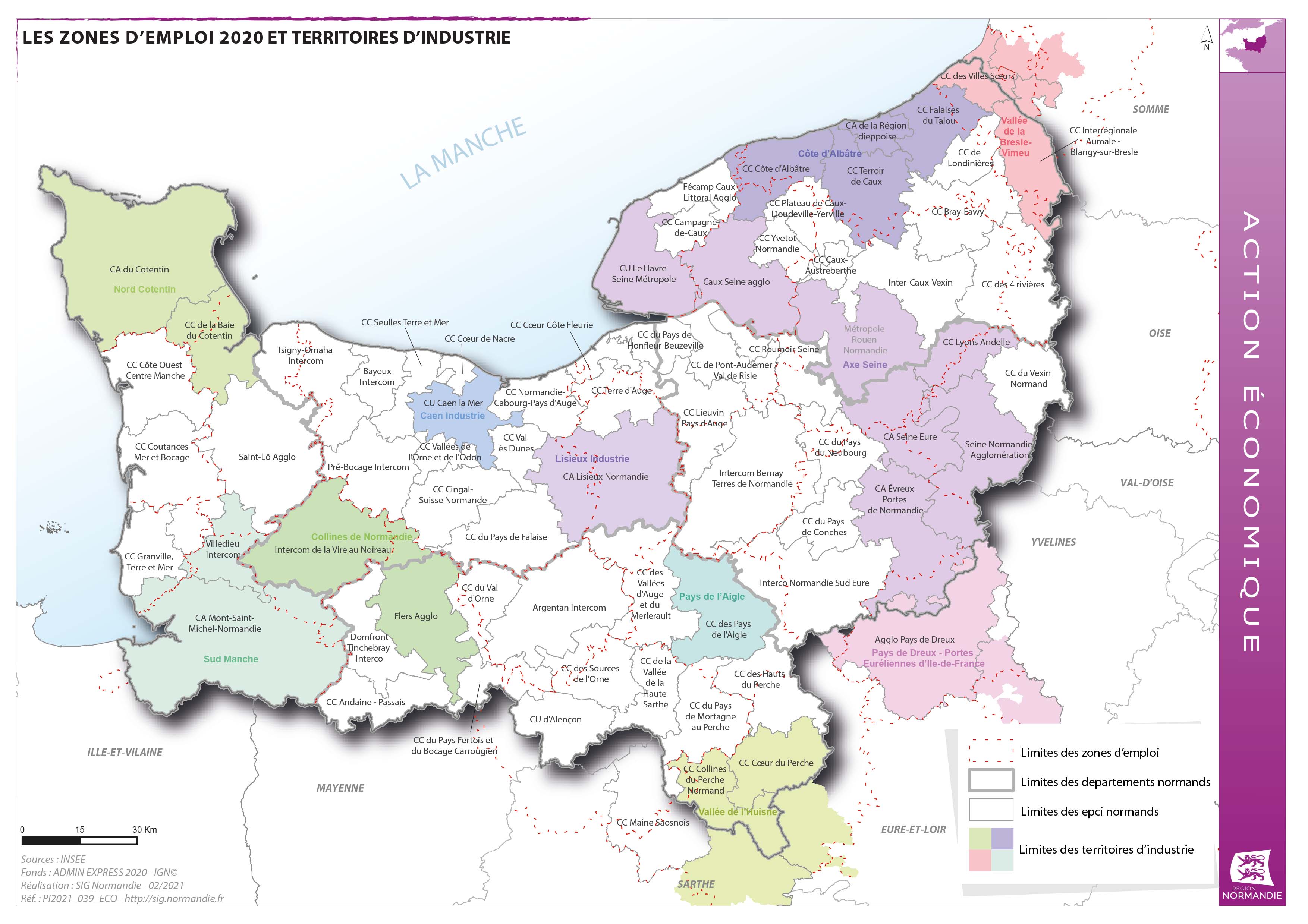 La Normandie compte 24 zones d'emploi dont 5 trans-régionales.